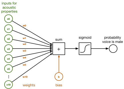 这即是我们这套利用逻辑回归实现的二元分类器的基本设计原理。输入至该分类器的数据为一段对20个数字进行朗读的音频记录,我们会计算出一条权重sum并应用sigmoid函数,而我们获得的输出概率指示朗读者应为男性。