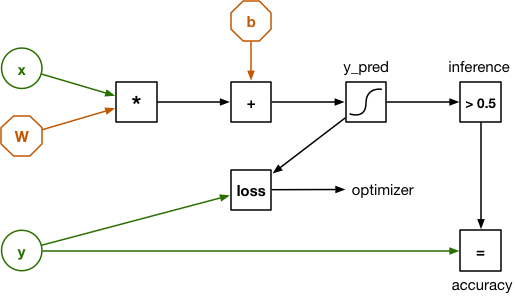 然而,我们仍然需要建立用于训练该分类器的机制,而这时就需要请出今天的主角——TensorFlow了。在TensorFlow中实现此分类器要在TensorFlow当中使用此分类器,我们需要首先将其设计转化为一套计算图(computational graph)。一项计算图由多个负责执行计算的节点组成,且输入数据会在各节点之间往来流通。