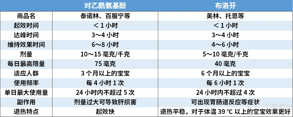 注: 对乙酰氨基酚混悬液只适用于 2~3 月以上的孩子,而布洛芬混悬液只适用于 6 个月以上的孩子。