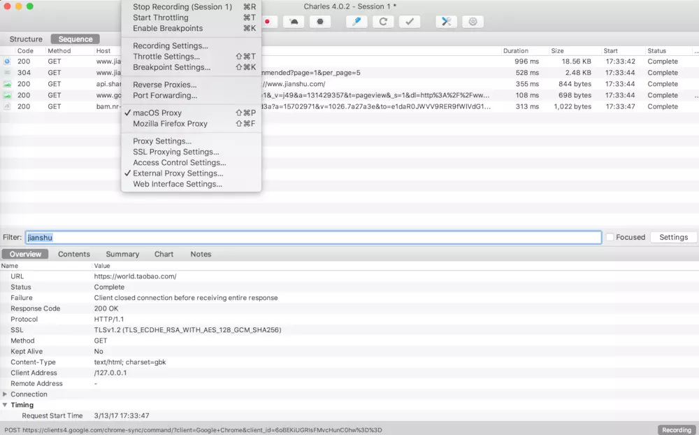 Charles的Proxy菜单下是否勾选External Proxy Settings