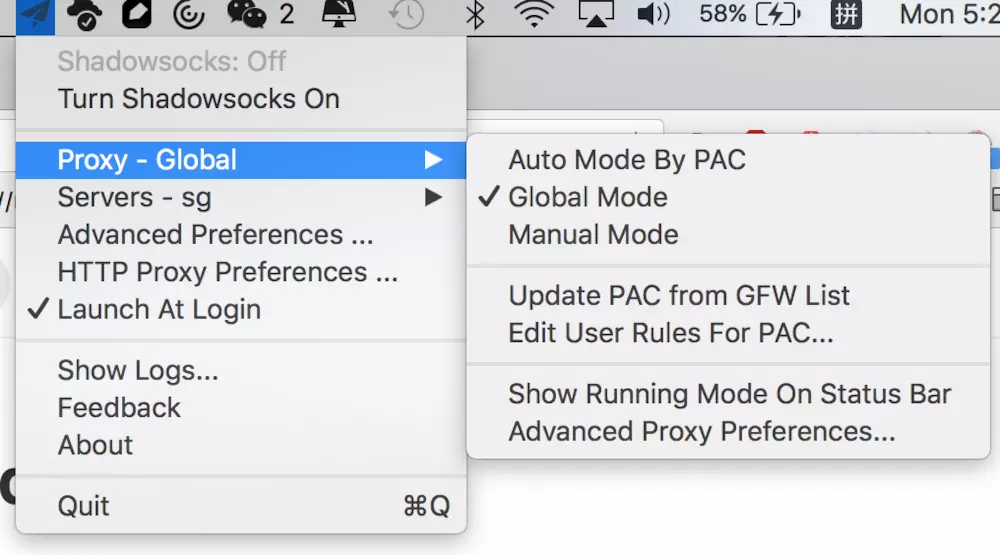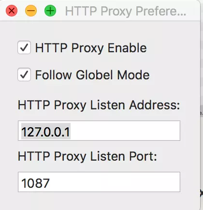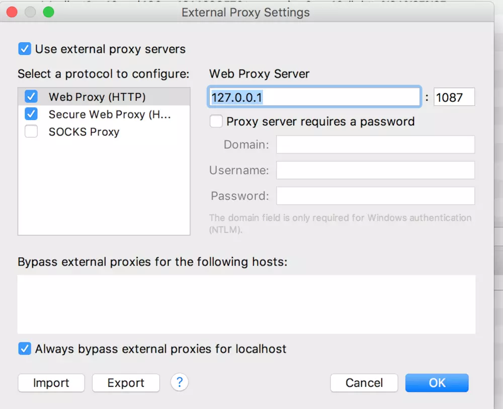 External Proxy Settings里的地址和端口设置是与ShadowsocksX-NG的“Http代理设置”里显示的一致
