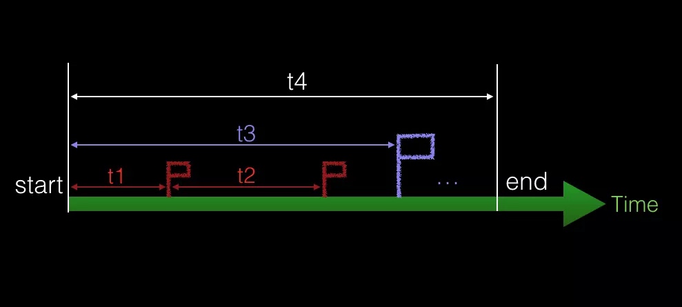 如上图所示,在时间轴上,我们从 start 开始打点计时,然后我们在第一个小红旗那里打了一个点,记录这段代码的耗时,然后又在第二个小红旗那里打了一个点,记录这中间代码的耗时。然后在结束的地方打一个点,然后把所有打点的结果展示出来。同时,我们为每段计时加上标注,用来区分这段时间是执行了什么操作花费的时间。这样一来,我们就能快速精准的知道究竟是谁拖慢了启动。